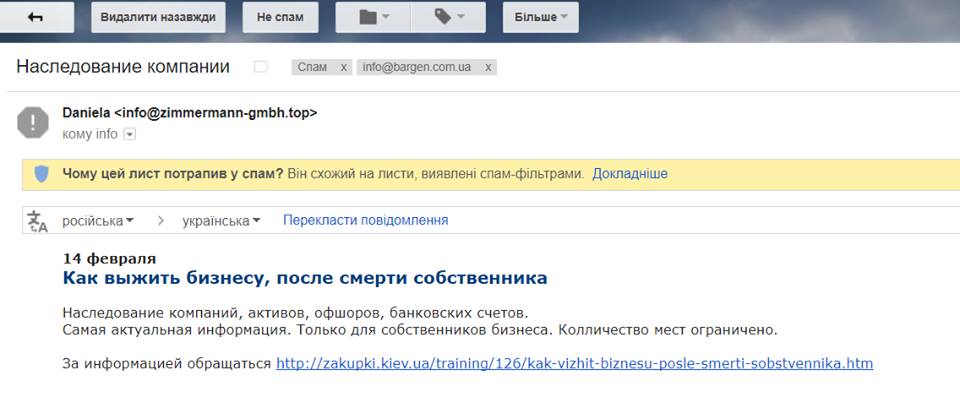 لقد تلقينا رسائل غير مرغوب فيها مضحكة في بريد شركتنا. حدث لأصحاب الأعمال حول ما يجب فعله بعد وفاتك 🙂 لا نعرف لماذا يدرسون هناك، ولكن يتم اختيار الجمهور المستهدف بطريقة احترافية.