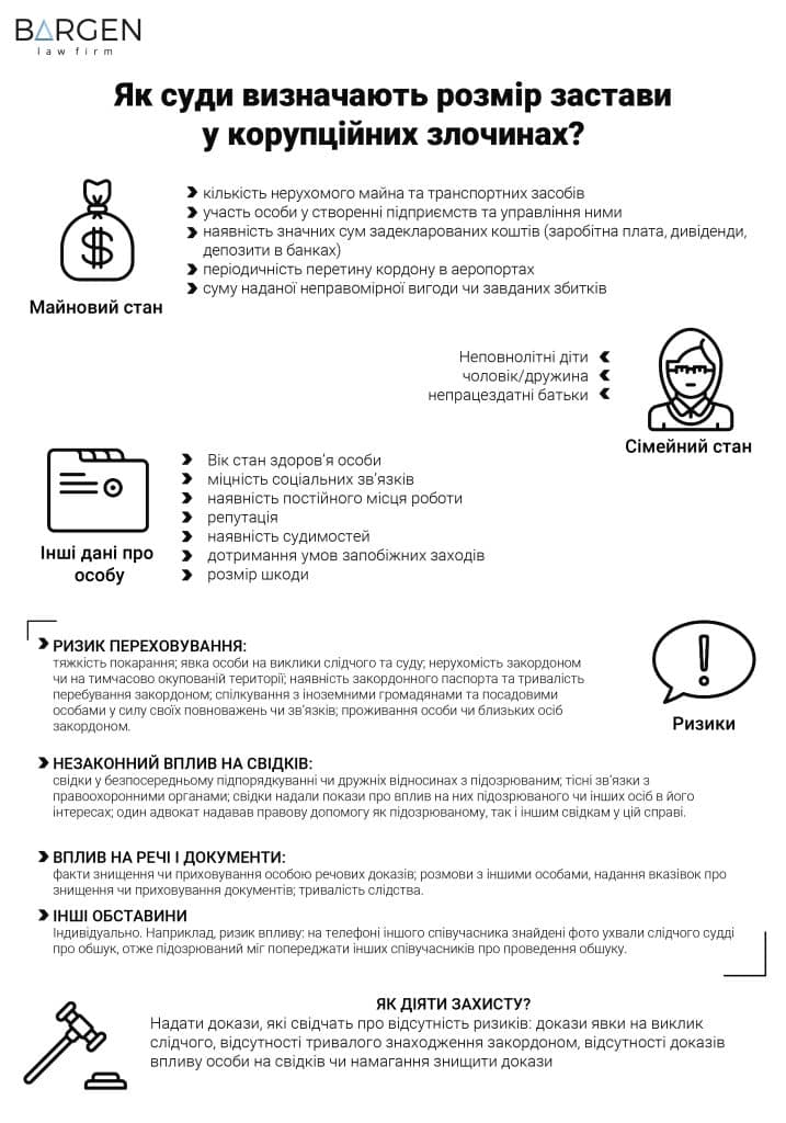 على سبيل المثال، في القرار المؤرخ 31 يناير 2020، في القضية رقم 991/979/20، طلب المحقق تحديد كفالة المشتبه به بمبلغ 40 مليون هريفنا أوكراني. ولإثبات تخفيض مبلغ الكفالة، أخذت المحكمة في الاعتبار حقيقة أن الشخص لم يعبر الحدود في عام 2019، ومبلغ المنفعة غير القانونية المقدمة بمبلغ 50 ألف. دولار أمريكي وتحديد تعهد بمبلغ 19 مليون غريفنا.