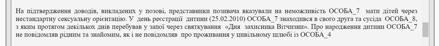 "Los representantes de la demandante señalaron la imposibilidad de tener hijos. debido a una orientación sexual no estándar. El día del registro del niño (25 de febrero de 2010), el imputado se encontraba con su amigo y vecino, con quien llevaba varios días bebiendo con motivo de la celebración del "Día del Defensor de la Patria".. No informé a familiares y amigos sobre el nacimiento del niño"